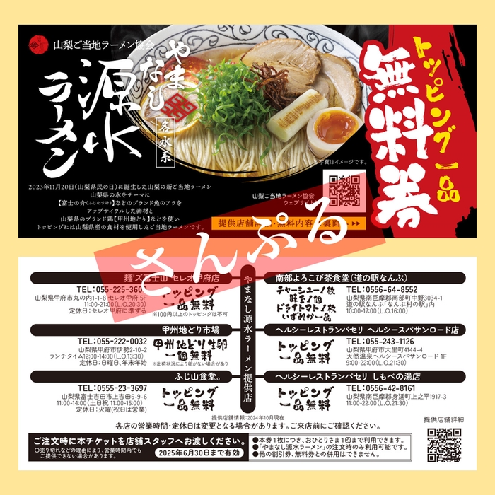 トッピング無料券は、「やまなし源水ラーメン」の一部提供店舗を始め、山梨県内の以下の施設で配布します。
