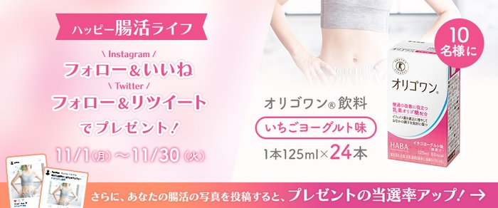 ハーバーでは、腸活を手軽に始められる、特定保健用食品(トクホ)の「オリゴワン(R)飲料」Instagram&twitterプレゼントキャンペーンを実施中!