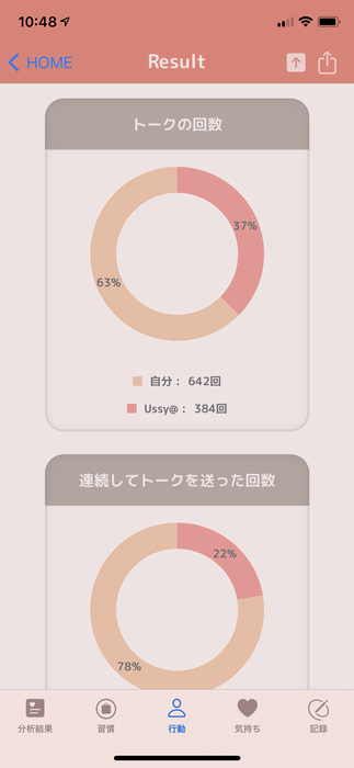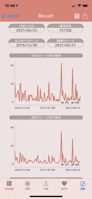 例えば、「お互いがよく使っている言葉」を見ると、普段の自分はこんな口癖なのか・・・!と気づくことができます。また、「お互いのトーク数の時系列推移」では、2人が一番盛り上がっていた時がいつなのかがひと目で分かります。