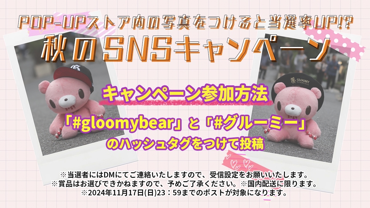 「#gloomybear」と「#グルーミー」のハッシュタグをつけて、POP-UP ストア開催期間内に投稿してください。