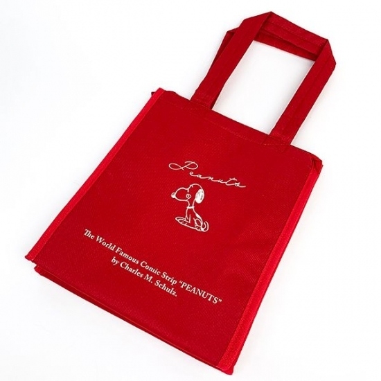 まずは、レッドカラーのオシャレなランチバッグをご紹介します。縦長のスクエアフォルムが使いやすい、シンプルデザインです。中央には、レトロ感のあるタッチのスヌーピーのデザイン。フレンチっぽい雰囲気が素敵です。