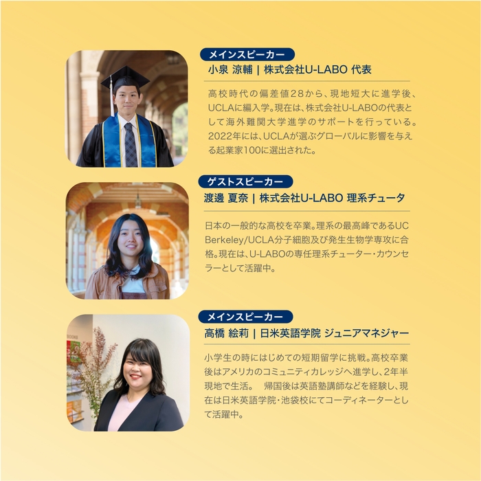 本企画では、U-LABO代表の小泉涼輔がスピーカーとして登壇し、名門大学カリフォルニア大学ロサンゼルス校(UCLA)へ編入後飛び級で卒業した体験談を紹介します。さらに、UCLA理系学部の卒業生や日米英語学院のコーディネーターもスピーカーとして迎え、普通の高校生が世界トップ大学への留学を実現するための方法や対策についてもご紹介します。
