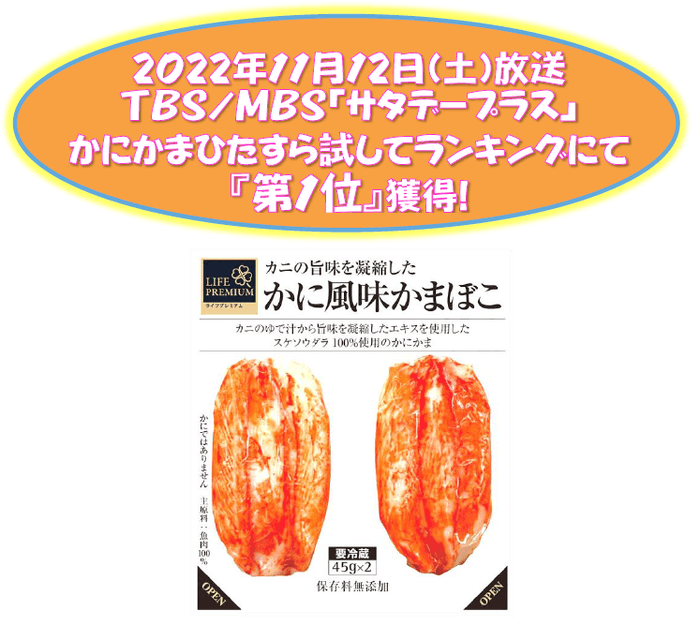 カニのゆで汁から旨味を凝縮したエキスを使用しており、かにの風味をリアルに再現した「かに風味かまぼこ」。昨年11月にTBS/MBS「サタデープラス」にておいしいかにかまを決める“かにかまランキング”にて、「まるで本物のかにのような味わい!」「おいしい!」と評価いただき『第1位』を獲得いたしました。放送後約1カ月で8万個を販売し、リピート率も脅威の13.8%(※2)と、ライフプレミアム史上の大ヒット商品となりました。