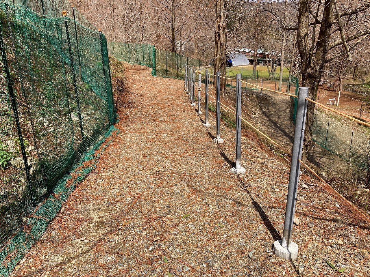 平面のドッグランが一般的に普及していますが、野生の血が濃く残る和犬にとっては、それでは十分なストレスを解消出来ていないのではないかと飛鳥苑長が日頃考えていたことが、地の利を活かした里山の活用方法につながりました。第1期工事分、全長150mの周回コース(面積250平米)が完成しました。