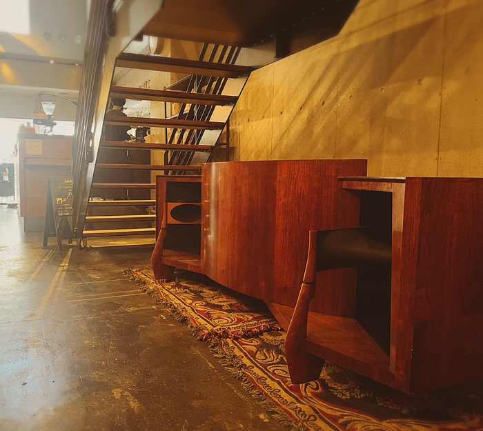 1階はカフェ、2階はインテリアショールームという複合施設の当店。開放感のある高い天井にシックなインテリアが随所に広がり、来店するお客様の好奇心を刺激します。階段下にひっそりと置かれたJBLスピーカーの名機「Paragon(パラゴン)」が奏でる音楽は広々した空間に反響し、ゆったりとした空間を作り出しています。 建築とインテリアとコーヒーがコラボレートし織りなす複雑な味わいは、ちょっと背伸びした大人の気分にさせてくれる唯一無二のお店です
