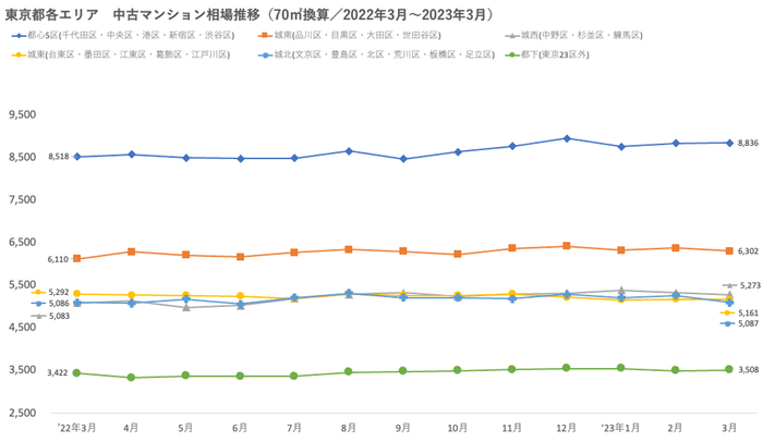 ■首都圏主要エリア 中古マンション相場推移(2022年3月~2023年3月)