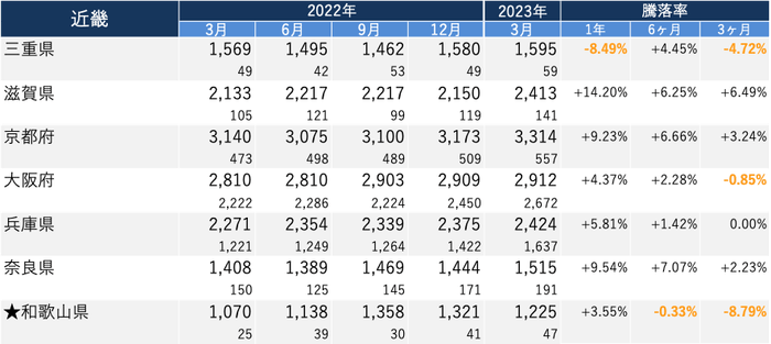 価格:「京都府」 3,314万円/騰落率:「滋賀県」 +14.20%