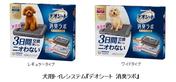 ※1 愛犬1頭(レギュラー:体重4kg以下、ワイド:体重10kg以下)の尿吸収時。ウンチをした場合は早く取り除いてください。普段の生活での消費者テストにて「3日間マットがニオわない」と回答した消費者87.9%。閉鎖空間にて1日1回20ccの犬尿を滴下した後での3日後の臭気判定士による臭気強度・快・不快度評価の実施、また、20ccの犬尿を滴下した後の3日後のアンモニア濃度評価を実施、ユニ・チャーム調べ。