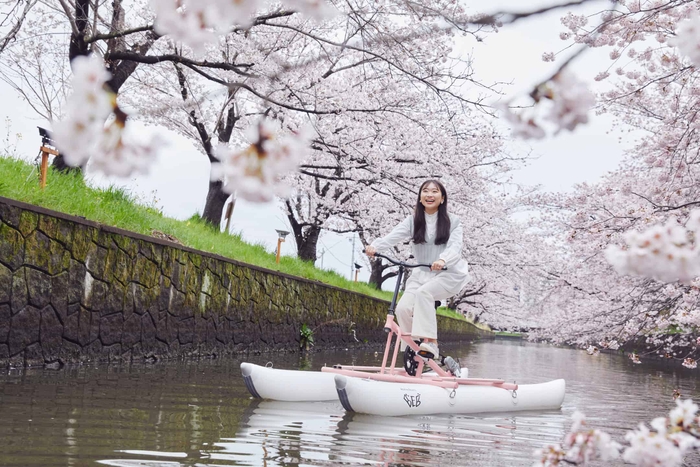 星野リゾート初の自転車を楽しむホテル「星野リゾート BEB5(ベブファイブ)土浦」は、2023年3月25日から4月10日までの期間、桜の絶景を川面から独り占め!「お花見水上サイクリング」を開催します。このアクティビティは、BEB5土浦からほど近い場所にある土浦市の桜の名所「新川」で実施します。水の上を走ることのできる水上自転車に乗って、ひと味違ったお花見を楽しめます。川の両岸に約2kmにわたって桜並木が続くこの場所は、土浦でも有数のお花見スポットです。川の上は場所取りも不要!桜の絶景を独り占めしながら、地元で長年愛される和菓子店「志ち乃」の桜餅とさしま茶を持って水上サイクリングを満喫できます。