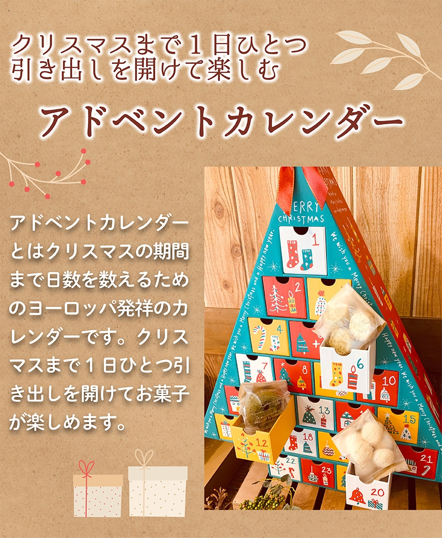 アドベントとはイエス・キリストの誕生を待ち望む期間のことで、クリスマスまでの日めくりタイプの暦として、1から24の数字を開けると“お楽しみ”が出てくる仕かけのあるアドベントカレンダーが人気です。
