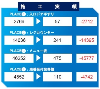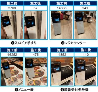 試験方法:ATPふき取り検査(A3法)※で作業前後の汚れの数値を計測したところ、作業前と比べて作業後の数値が大幅に減少しており、高い抗菌・抗ウイルス効果を生んだことが分かります。光触媒は蛍光灯などの光が当たると、抗菌・抗ウイルス作用が発生します。よって、コーティング後は日常生活を送るだけで、この数値はどんどん下がっていきます。