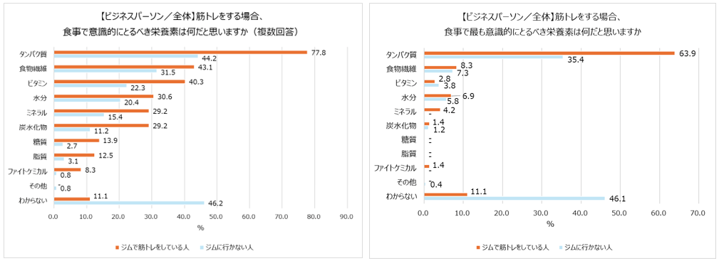 体づくりのプロの回答は、ビジネスパーソンの回答と比べて「炭水化物(88.4%)」「脂質(72.1%)」の割合が多いという差が見られました。