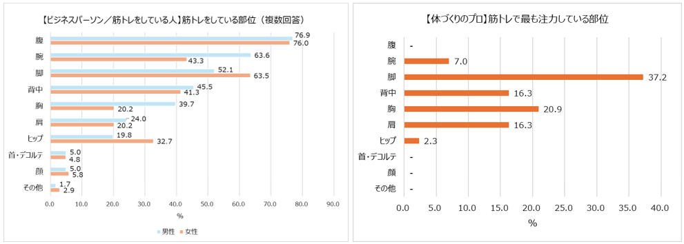 筋トレをしている部位の1位は男女ともに「腹」。体づくりのプロは「脚」が1位