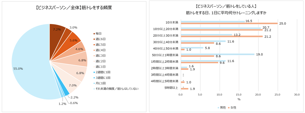 ジムでの運動に限らず、筋トレを実施しているか、その頻度を聞いたところ、ビジネスパーソンは45.0%が月に1回以上、41.0%が週に1回以上筋トレをしていることが分かりました。1日のトレーニング時間は、男性は「10分以上20分未満(20.7%)」、女性は「10分未満(25.0%)」と回答した人の割合が最も多い結果となりました。男女ともに、2時間未満という人が大多数を占めました。