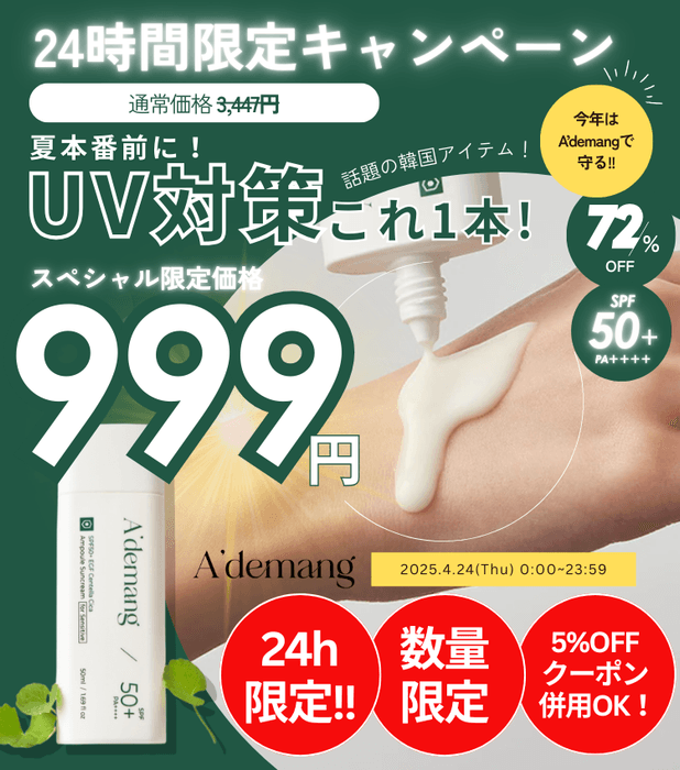 韓国の大人気スキンケアブランドA'demangが24時間限定!スキンケアのような日焼け止めをQoo10にて999円で発売!