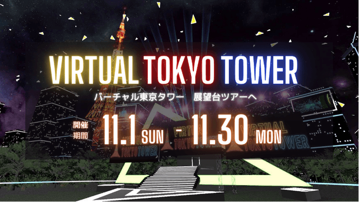 バーチャル東京タワーは、“100年後の東京タワー”をイメージした未来型エンターテインメント空間です。「アバター」と呼ばれる3Dモデルを使用して、本物の東京タワーと同じようにメインデッキ(高さ150m)やトップデッキ(高さ250m)に昇り、東京の中心から360°のパノラマ夜景を楽しむことができます。また、マルチ参加している他者とコミュニケーションを取ることができ、バーチャル東京タワー内でデートをしたり、イベントに参加することが可能です。