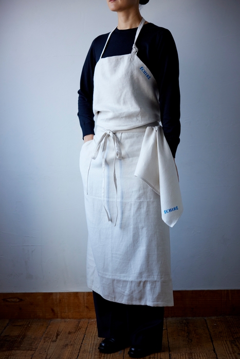 エシレのブルーの刺繍が入ったエプロンとトルション(布巾)のセット。国産のリネン生地は厚みのあるリッチなもので、洗濯するごとに風合いがでてきます。エシレのロゴが印刷された巾着袋付き。