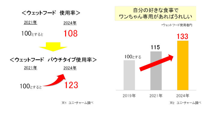 犬用フード市場において、愛犬の食べ悩み対策として、ドライフードと一緒に与えることで食いつきが良くなるウェットフードの使用率が拡大しています。その中でもパウチタイプは、与えやすさや処理のしやすさから、さらに使用率が拡大しています。※1近年では、「ワンちゃんに喜んで食べてほしい」という意識が高まるとともに、また「自分の好きな食事でワンちゃん専用のものがあればうれしい」というお声を多数いただいています。※2
