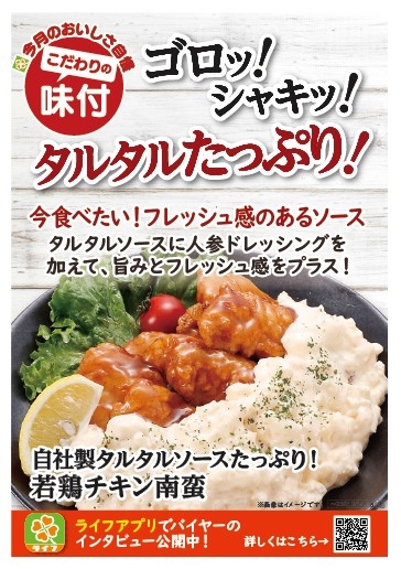 “おいしい” “ワクワク” “ハッピー” をお届けするライフコーポレーションは、惣菜コーナーの人気商品「チキン南蛮」をさらにおいしくリニューアルし、8月1日より販売を開始いたしました。