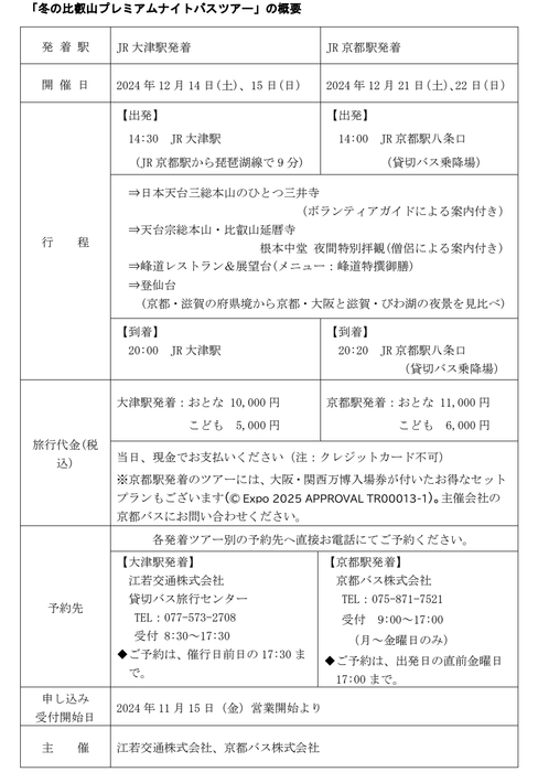 江若交通株式会社(本社:滋賀県大津市、代表取締役:安積正彦)と京都バス株式会社(本社:京都市右京区、代表取締役社長:吉本直樹)は、一般社団法人比叡山・びわ湖DMOの協力を得て、標高800mの比叡山から京都・大阪・滋賀の夜景を満喫する「冬の比叡山プレミアムナイトバスツアー」の販売を開始します。