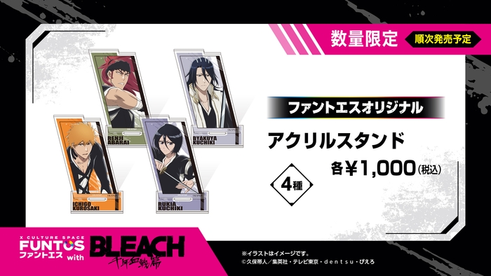 描き下ろしイラストを使用したアクリルスタンドです。黒崎一護、朽木ルキア、朽木白哉、阿散井恋次の4種展開。