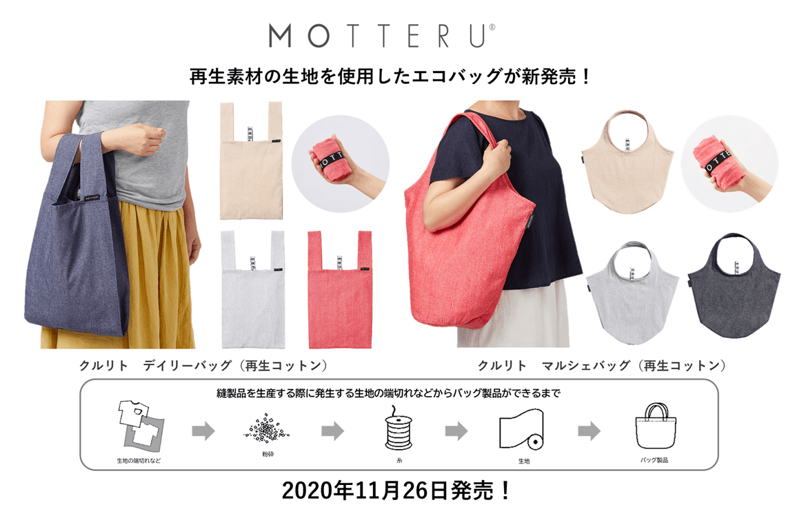 株式会社トレードワークス(本社:東京都渋谷区)は、エシカルブランド「MOTTERU(モッテル)」より、「クルリト」シリーズの新製品として、再生素材を使用した「クルリト デイリーバッグ(再生コットン)」「クルリト マルシェバッグ(再生コットン)」を11月26日より発売します。