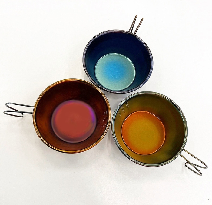 世界で唯一の色調均一化を可能としたステンレス発色技術である「ORORU(R)処理」により、ステンレスのシェラカップに発色加工を行いました。