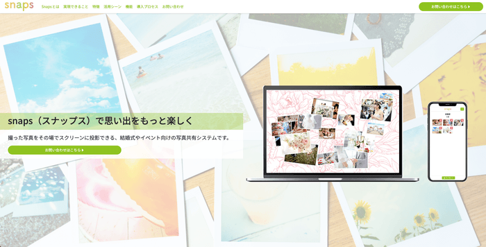 「Snaps」は、撮った写真をその場でスクリーンに投影できる、結婚式場やイベント会場向けのクラウド型写真共有システムです。インターネットに接続されたブラウザがあれば誰でも簡単に導入・運用が可能です。