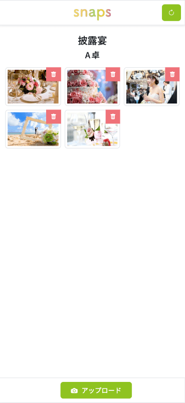 当日アップロードされた写真を全て確認できます。また、事前にスクリーン投影用の画像をアップロードしておくことも可能です。万が一不適切と思われる写真がアップロードされた場合は手動で削除することができます。