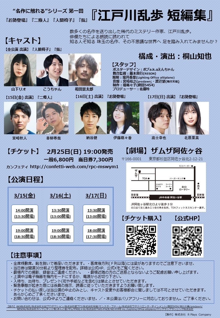 R Plays Company(代表:佐藤玲)主催、桐山知也が構成・演出を手掛ける『“名作に触れる”シリーズ 第一回「江戸川乱歩 短編集」』が2024年3月15日 (金) ~2024年3月17日 (日)にザムザ阿佐谷(東京都杉並区阿佐谷北2丁目12-21ラピュタビル B1F)にて上演されます。