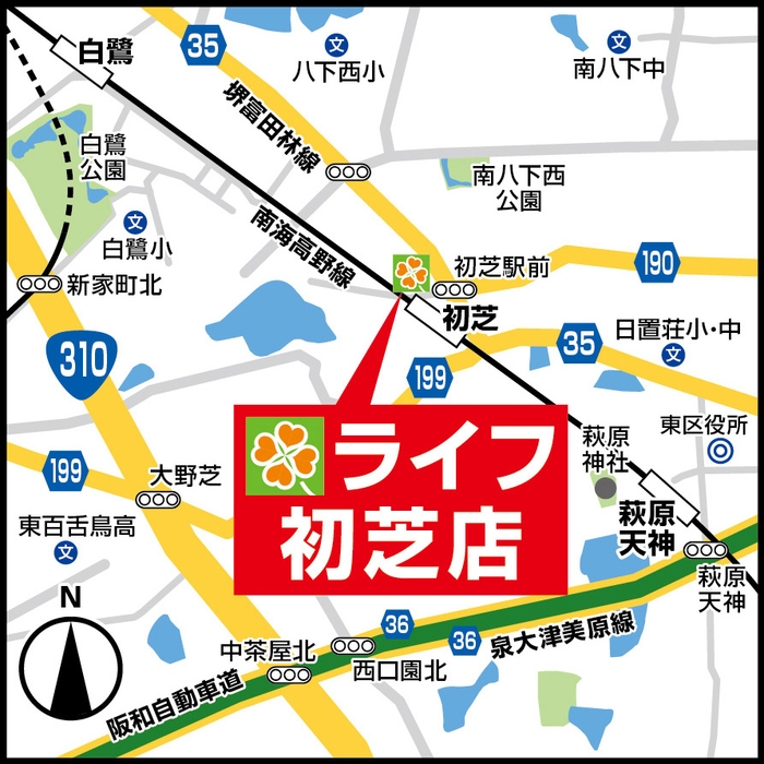 ・当店は南海高野線「初芝」駅より北西に約100mに位置し、店舗周辺は戸建を中心に住宅街が広がるエリアです。