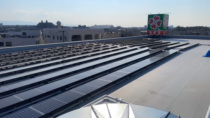屋上に設置した太陽光発電設備にて再生可能エネルギーを創出することで、CO2排出量を削減し『持続可能で豊かな社会の実現』に貢献いたします。年間で約14万kWhの発電を見込んでおり、店舗の使用電力の一部として活用いたします。