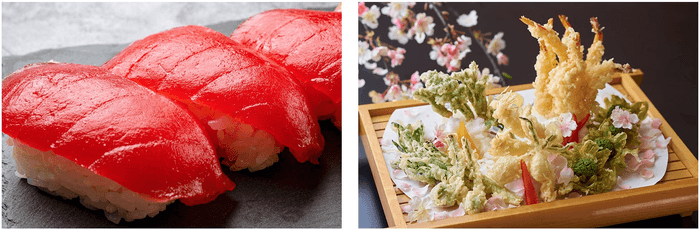 左:まぐろの王様、本まぐろの握り寿司。さらに、脂乗りと上品な白身の美味しさが楽しめる金目鯛の握り寿司もご用意いたしました。
