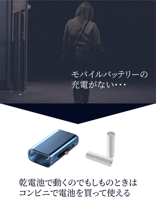 乾電池式なのは、調達のしやすさとモバイルバッテリーの充電を忘れていたら使えなくなるからです。