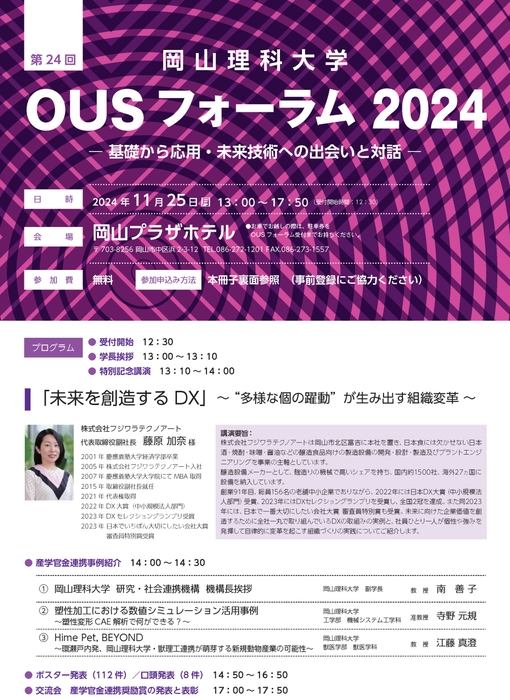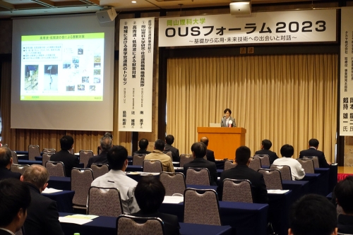 岡山理科大学では、研究者たちが持つ技術シーズを地域に紹介し、産学官金連携を推進するため、毎年「OUSフォーラム -基礎から応用・未来技術への出会いと対話-」を開催しています。