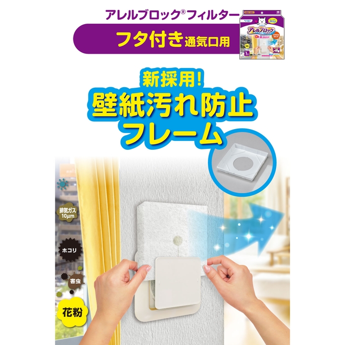 シールのようにすき間なく「パッ!」と貼るだけで取り付けられるアレルブロックフィルター(通気口用)が、花粉・ホコリ・排気ガスなどのアレル物質をキャッチして除去し、汚れた空気の侵入をブロックして、おうちの中にキレイな空気を取り込むことができます。