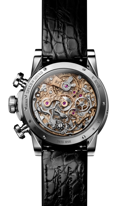 スイスの彫刻・工芸作家 ヤン・フォン・ケーネルがギヨシェ彫りを施した個性的なブラックダイアル。光と音の速度差から対象までの距離を測定できるテレメーターを外周に表示。例えば雷の場合、光った瞬間から音が聞こえるまでの時間をクロノグラフで計測し、クロノグラフ秒針が指すテレメーター表示が雷との距離を示します。