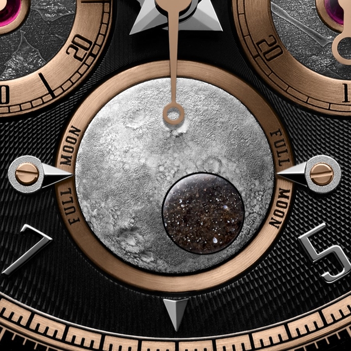 6時位置のムーンフェイズ表示は、発光塗料で手描きした月をモチーフとする回転ディスクに、クレーターに由来する濃いブラックの月隕石(ドファール457)をセットしています。ドファール457は、ルイ モネCEOのジャン=マリー・シャラーと親交が深い隕石ハンターのリュック・ラベンヌが、2001年にオマーンのドファール砂漠で発見しました。