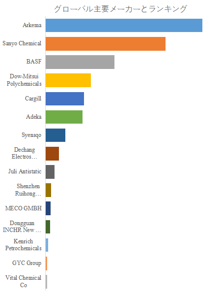 LP Informationのトップ企業研究センターによると、永久帯電防止剤の世界的な主要製造業者には、Arkema、Sanyo Chemical、BASF、Dow-Mitsui Polychemicals、Cargill、Adeka、Dechang Electrostatic Technology、Syensqo、Juli Antistatic、Shenzhen Ruihong Chemicalsなどが含まれている。2024年、世界のトップ10企業は売上の観点から約87.0%の市場シェアを持っていた。