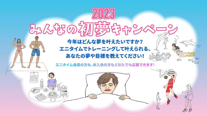 2023年2月28日(火)をもちまして、全国のエニタイムフィットネスにて実施しました『みんなの初夢キャンペーン2023』を終了いたしました。2ヶ月間にわたるキャンペーンに、多くの会員・未入会者の皆様にご参加いただき、エニタイムフィットネスでトレーニングすることで叶うさまざまな目標や夢をご応募いただきました。予想を超える反響をいただき、17,883 通ものご応募をいただきました!ご参加いただいた皆様ありがとうございました。