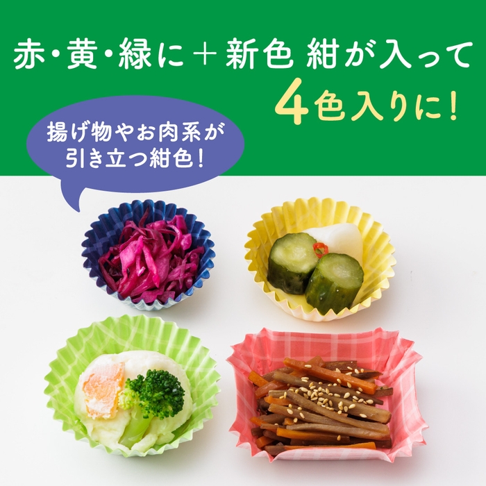■カップのカラーは「赤」「緑」「黄」+「紺」の全4色にすることで、お弁当のおかずを引き立たせます。