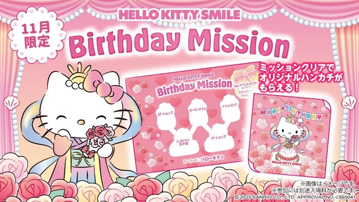 株式会社パソナふるさとインキュベーションが運営する、メディアアート&レストラン「HELLO KITTY SMILE」では、施設内にある5つのエリアを巡り、スタッフに合言葉を伝えると、限定デザインのハンカチがもらえる『HELLO KITTY SMILEのBirthday Mission』を11月1日(土)より期間限定で開催いたします。