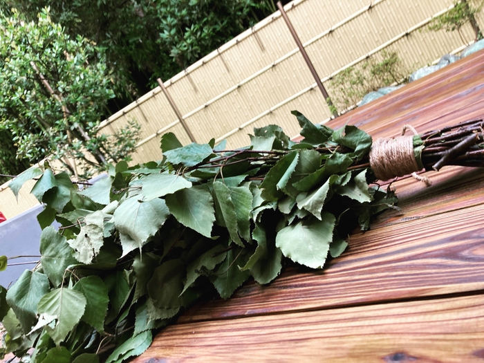 北海道上富良野で栽培した、貴重な国産白樺ヴィヒタを水風呂に浮かべます。