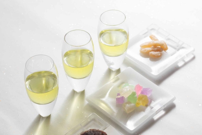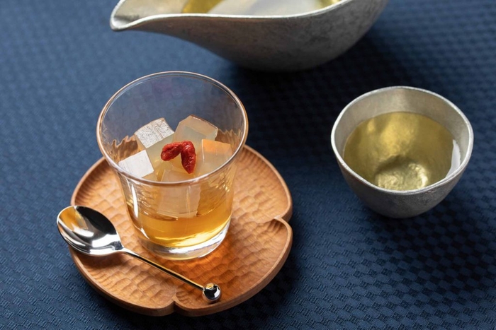福尾商店のさっぱりとした風味の梅寒天と、慶長元年創業・日本酒の老舗「豊島屋本店」の華やかな純米酒「江戸酒王子」の組み合わせを堪能できます。