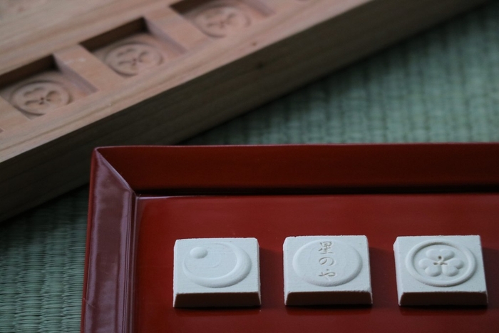 和三盆糖の上品な風味のある「とらや」の干菓子と「ミカフェート」の程よい酸味の珈琲の掛け合わせを楽しめます。また、星のや東京のロゴを模ったオリジナル落雁の繊細な風合いも楽しめます。