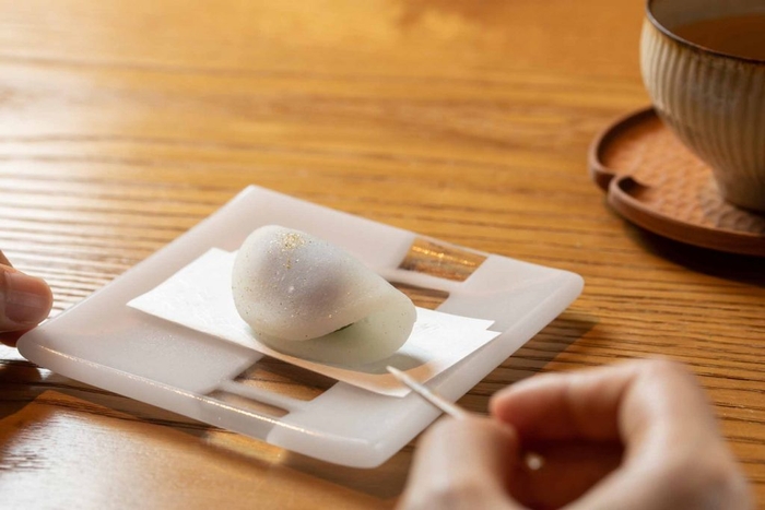風味豊かなヨモギ入りの餡に求肥をまとった唐衣と日本茶専門店「一保堂茶舖」の香り高いほうじ茶の組み合わせを堪能できます。
