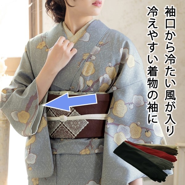 着物は袖口が大きく開いているため、袖口から風が入って冷えてしまいます。そんな冬場の和装にぴったりのロング手袋です。