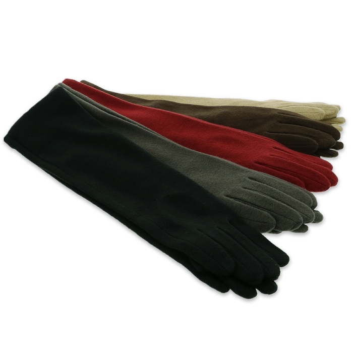 柔らかいアクリル100%でできた、全長約38cmのロング丈の手袋。腕を寒さからしっかりと守ります。人差し指と親指はタッチパネル対応なので、スマートフォンの操作も可能です。シンプルなデザインとカラーなので、和服はもちろんカジュアルな洋服にもよく合います。