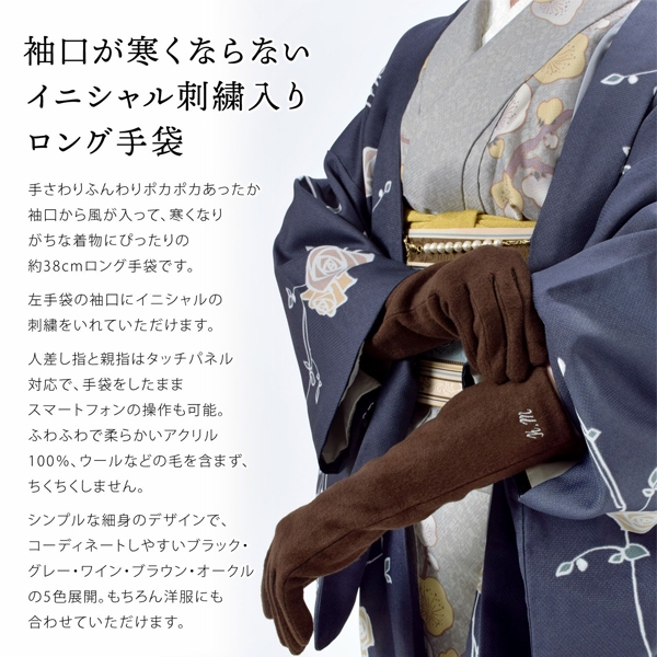 京都きもの町による冬の和装におすすめのロング手袋に名入れ刺繡サービス開始。贈り物に人気のロング手袋に名入れ刺繍を入れることでより特別なギフトに。ワンポイントのイニシャル刺繍がお洒落です。手袋は選べる5色展開。スマホ操作OK。