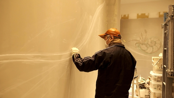 ▼店舗はオーナー自らがデザイン。壁のラインを描く様子